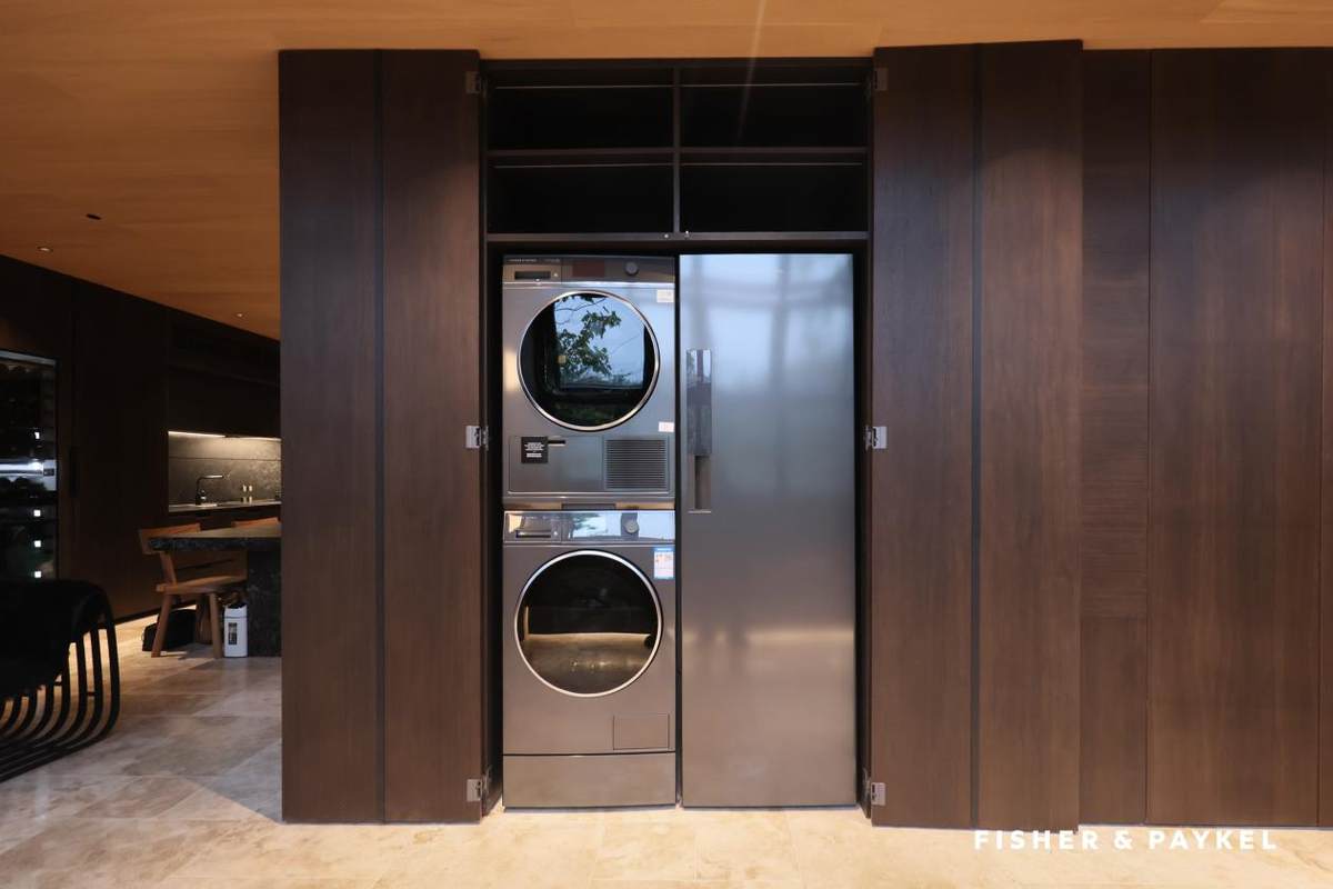 往店内深处走,便自然过渡到悦己洗护专区。独立的空间设计,保证私密性的同时,与整体门店风格无缝衔接。柜体内嵌入的洗衣机与烘干机,门板与柜体门板完全统一,实现完美隐藏。在这里,可灵活定制洗涤方案,精准控温与智能洗护技术,能妥善护理羊绒衫、真丝睡衣等高端面料;SmartDrive直驱变频科技还能有效降低噪音,带来静谧舒适的洗护体验。