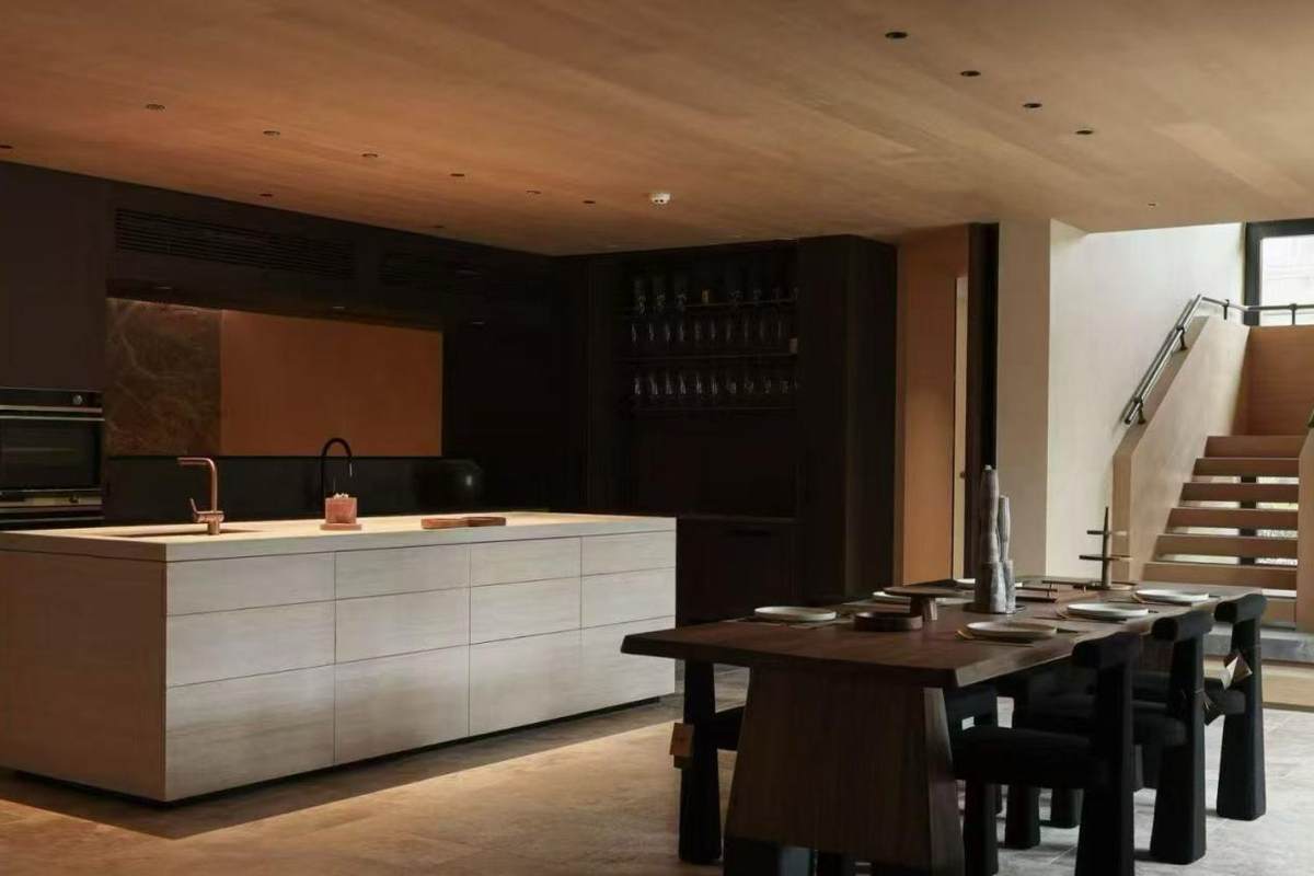 在“社交厨房”体验区,中央岛台贯穿空间,整合嵌入式电磁灶与储物模块,家人朋友可围坐于此,一边协作烹饪美食,一边畅谈生活趣事;3mm零嵌冰箱完美嵌入胡桃木柜体,无突兀缝隙,与整体装修风格浑然一体;抽屉式洗碗机隐藏于台面之下,使用时轻轻拉出,不破坏厨房互动动线,让烹饪与交流不再被空间分隔。既满足高效专业的烹饪需求,同时创造更多分享喜悦、连接彼此的可能。