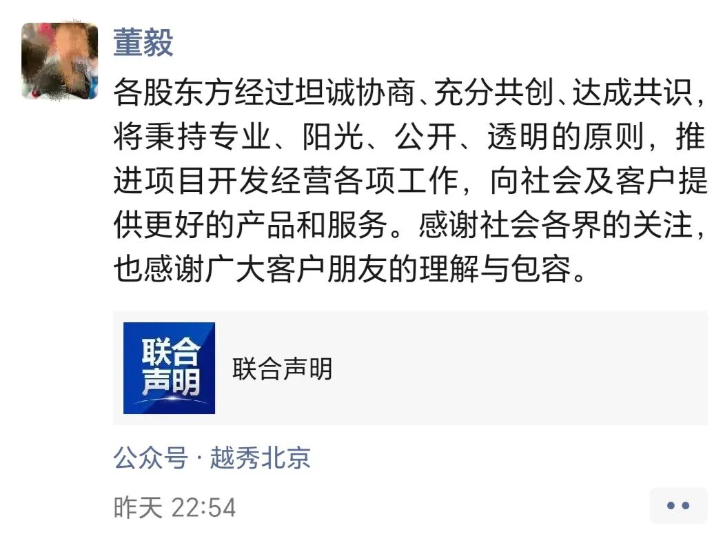 三方表示:各股东方经过坦诚协商、充分共创、达成共识,将秉持专业、阳光、公开、透明的原则,推进(紫京宸园、璞樾)项目开发经营各项工作,向社会及客户提供更好的产品和服务。