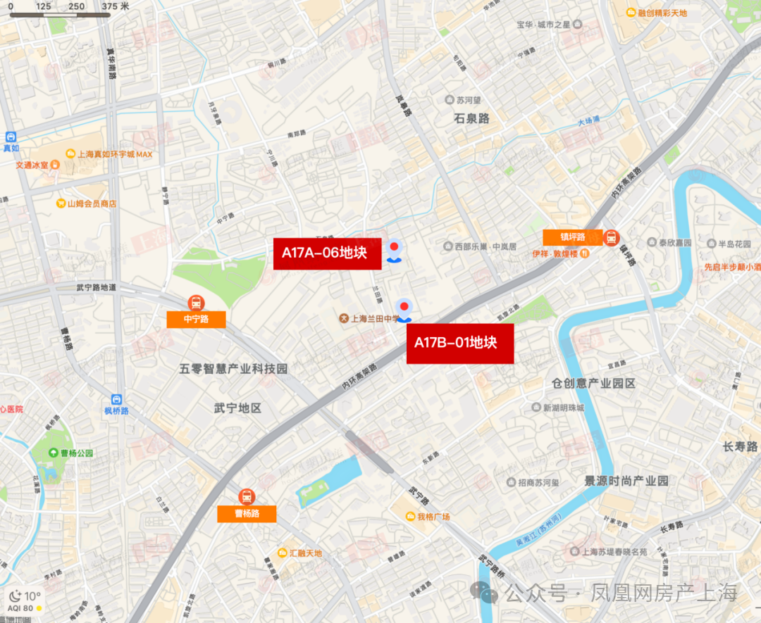 从区位条件看,两宗住宅地块虽处于3/4/7号线镇坪路站、14号线中宁路站及3/4/11/14号线曹杨路站五轨交汇影响范围,但实际步行距离均在1至1.2公里之间,属“轨交辐射区”。不过需要注意的是,A17B-01地块南侧紧邻内环高架,未来可能面临一定的噪音影响,这也是后续开发及购房者需要关注的细节。