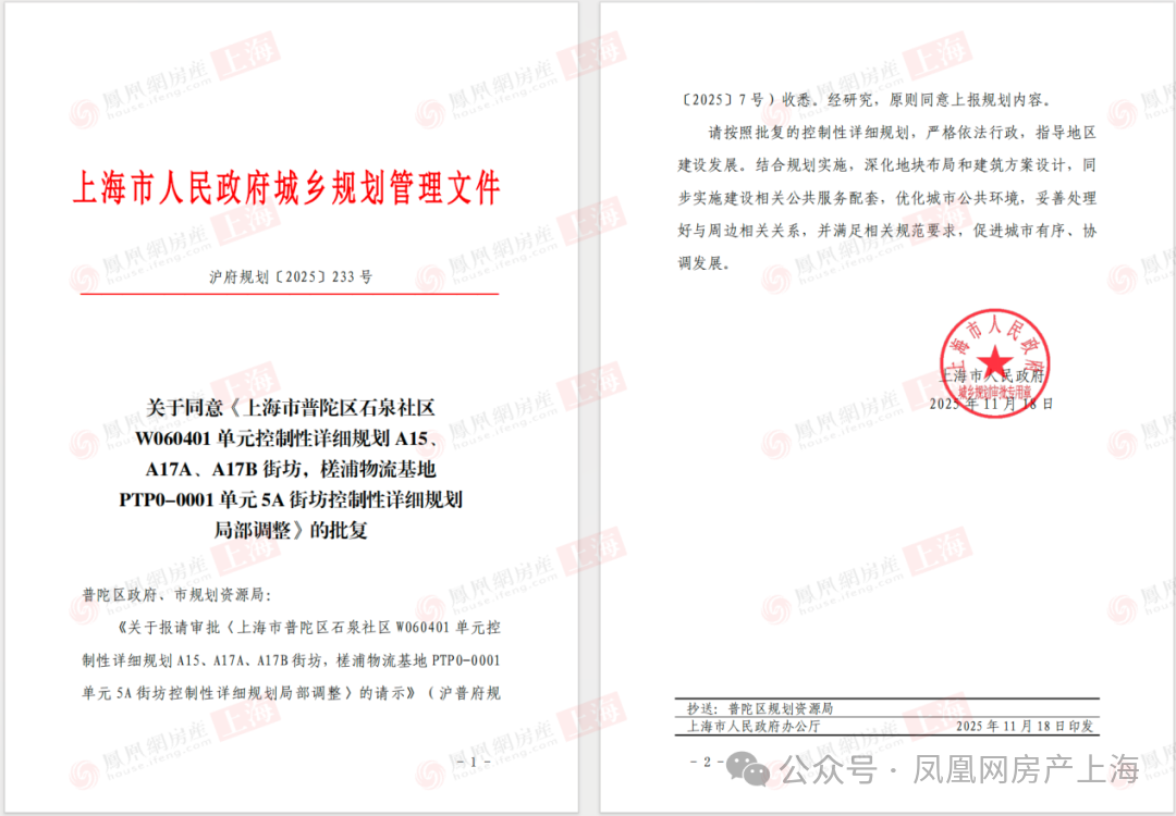 近日,上海市普陀区石泉社区W060401单元控制性详细规划A15、A17A、A17B街坊,槎浦物流基地PTP0-0001单元5A街坊控制性详细规划局部调整正式获批。