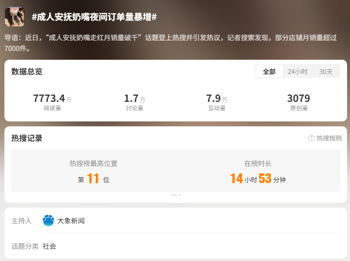 近期,#成人安抚奶嘴夜间订单量暴增# #成人安抚奶嘴销量火爆# 等话题一度登上微博热搜,并引发热议。