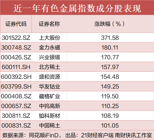 回顾近一年表现,A股指数有色金属(000819.SH)涨幅为61.4%,显著跑赢大盘,涨幅排名前10的成分股都实现了股价翻倍。