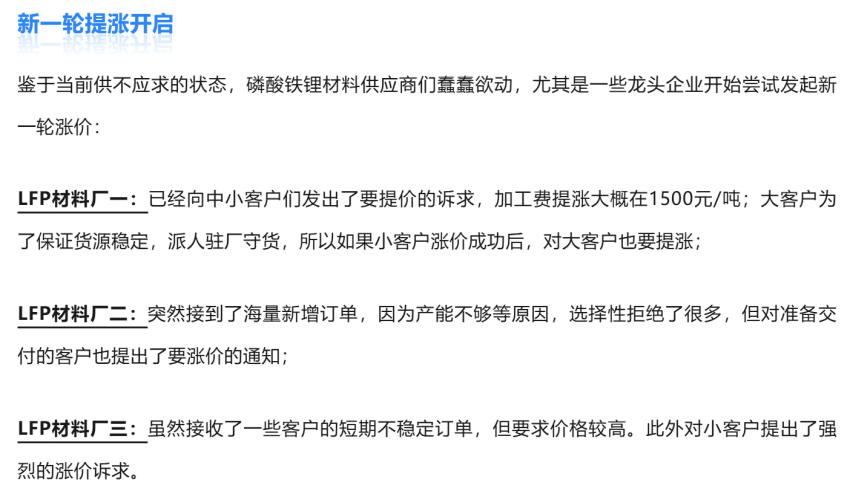 根据鑫椤锂电统计,与之前市场需求不佳,无论什么订单都尽量接收的情况不同,近期很明显的一个特点就是磷酸铁锂材料供应商有明显的挑客户行为,并且头部企业已经开始尝试发起新一轮涨价。