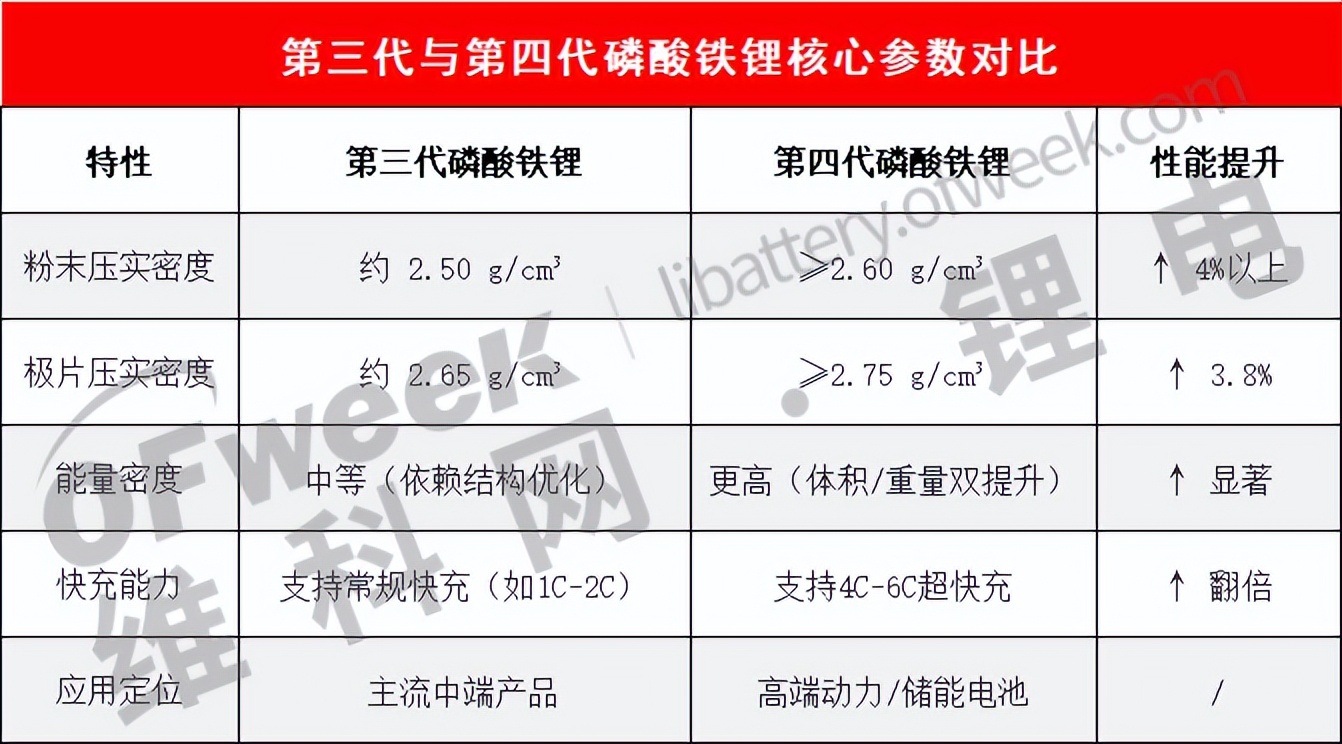 图片说明:第三代和第四代磷酸铁锂核心参数对比,数据来源于维科网锂电