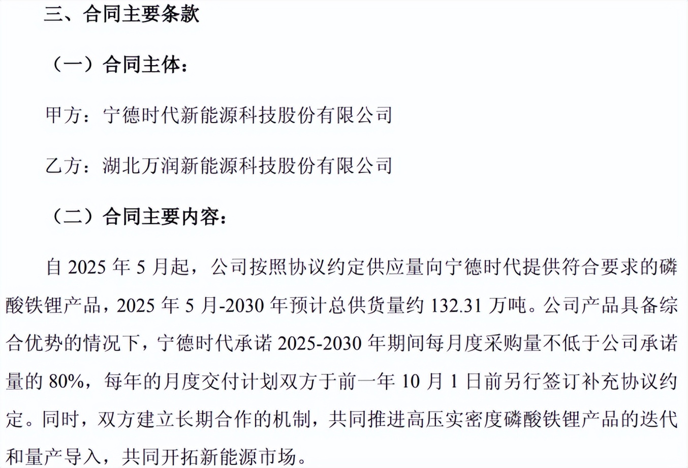 2025年5月20日,万润新能公告,自2025年5月起按照协议约定供应量向宁德时代提供符合要求的磷酸铁锂产品,2025年5月~2030年预计总供货量约132.31万吨;公司产品具备综合优势的情况下,宁德时代承诺2025~2030年期间每月度采购量不低于公司承诺量的80%。同时,双方建立长期合作的机制,共同推进高压实密度磷酸铁锂产品的迭代和量产导入,共同开拓新能源市场。