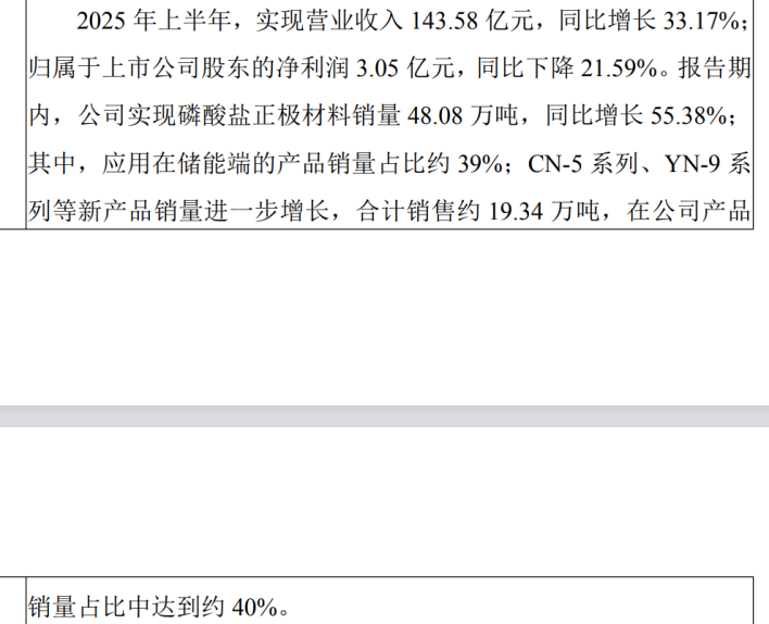此外,从磷酸铁锂行业“扛把子”湖南裕能(301358.SZ)的财报中也可以佐证这一点,第四代磷酸铁锂成为了行业分化的分水岭。2025H1湖南裕能实现高压实密度CN-5系列、YN-9系列等新产品合计销售约19.34万吨,在公司产品销量占比中达到约40%,这使得湖南裕能在储能景气度尚未爆发的2025H1,就达到了超过110%的产能利用率,同时也使得湖南裕能成为行业内唯一盈利的公司。