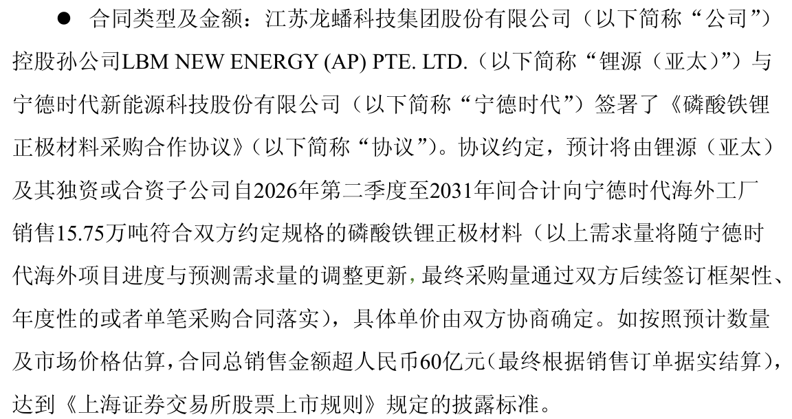 2025年9月15日,龙蟠科技公告,自2026年第二季度至2031年间合计向宁德时代海外工厂销售15.75万吨符合双方约定规格的磷酸铁锂正极材料,具体单价由双方协商确定。如按照预计数量及市场价格估算,合同总销售金额超人民币60亿元。