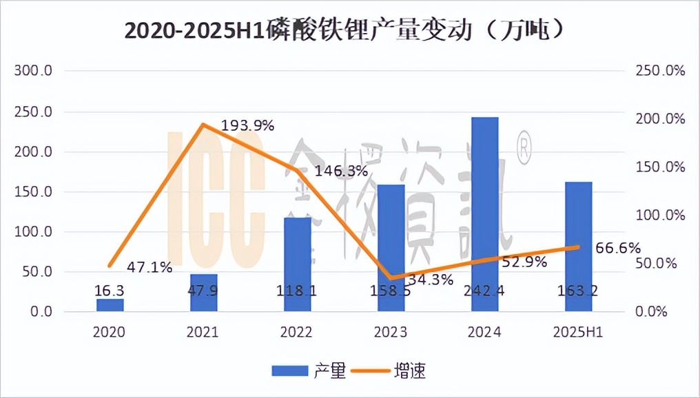 图片说明:磷酸铁锂产量及同比增速,数据来源于鑫椤锂电