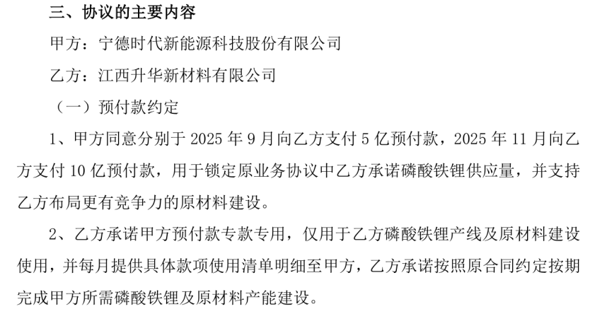 有意思的是,就在半个月前的9月18日晚间,富临精工发布公告称,江西升华于近日与宁德时代签订《预付款协议》,约定宁德时代向江西升华支付共计人民币15亿元的预付款,用于锁定江西升华向宁德时代承诺磷酸铁锂供应量,并支持江西升华布局更有竞争力的原材料建设。