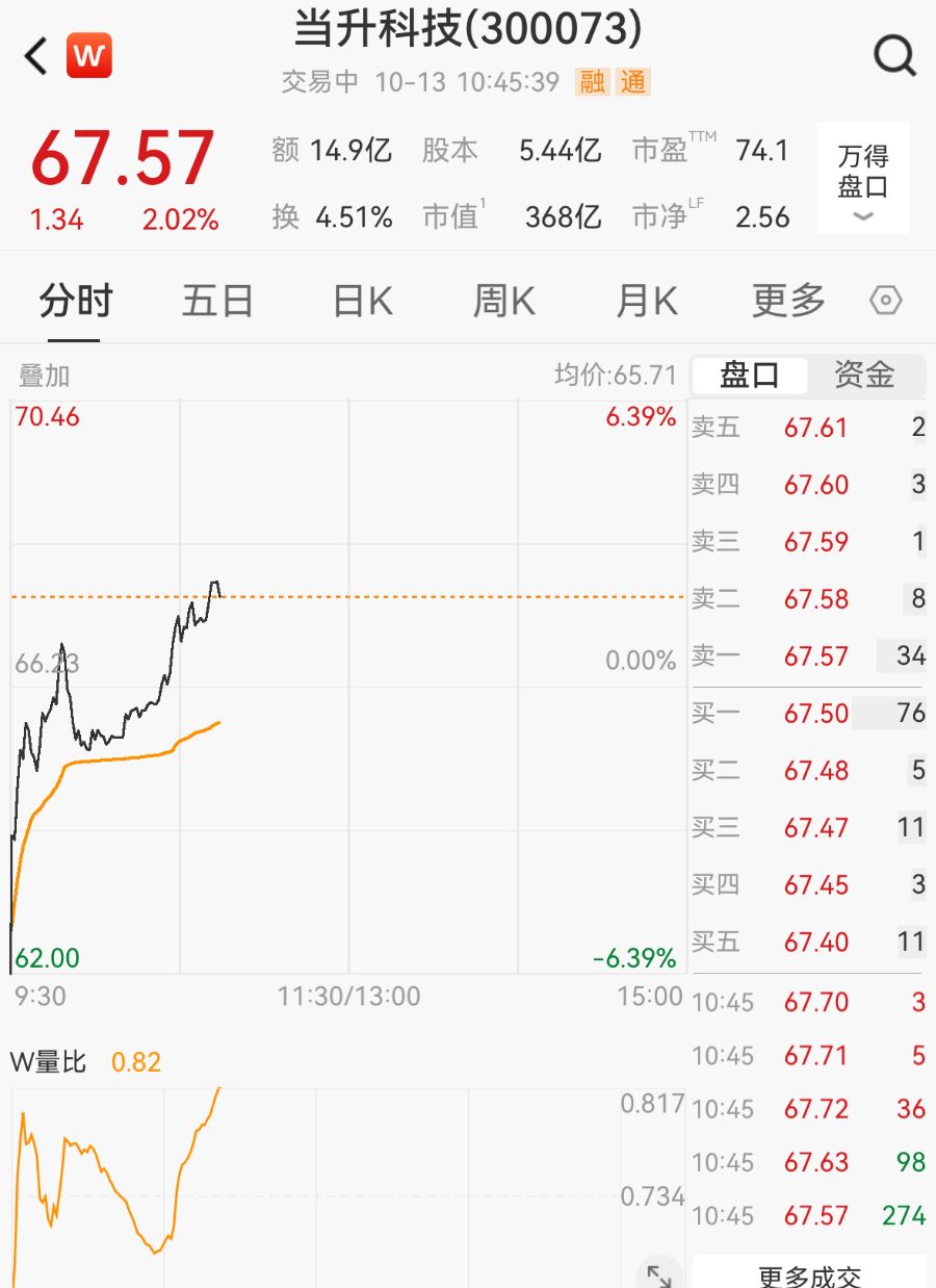 10月13日早盘,当升科技(300073.SZ)股价直线拉升,截至10:45报67.57元/股,涨超2%。上个交易日10月10日,该股跌超7%,报收66.23元/股。