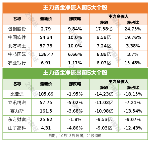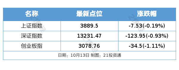 10月13日,市场全天震荡回升,三大指数低开高走,科创50指数低开近3%,午后翻红大涨逾1%。截至收盘,沪指跌0.19%,深成指跌0.93%,创业板指跌1.11%。沪深两市成交额2.35万亿元,较上一个交易日缩量1609亿元。