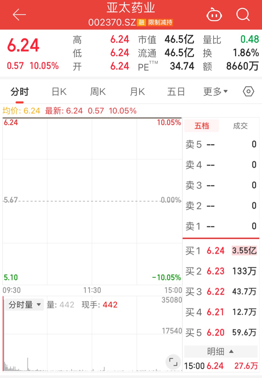 10月14日,深陷亏损泥潭的老牌药企亚太药业(002370.SZ)开盘即封涨停,截至收盘,报6.24元/股,封板金额达3.55亿元。