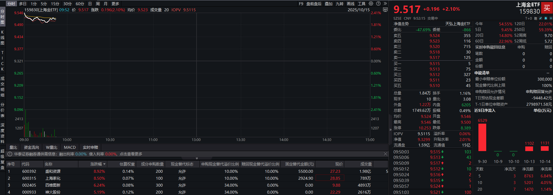 相关ETF中,上海金ETF(159830)高开现涨2.1%,成交额超1700万元。资金流向上看,据Wind数据显示,该ETF本周连续两日获资金净流入,累计“吸金”超2000万元。