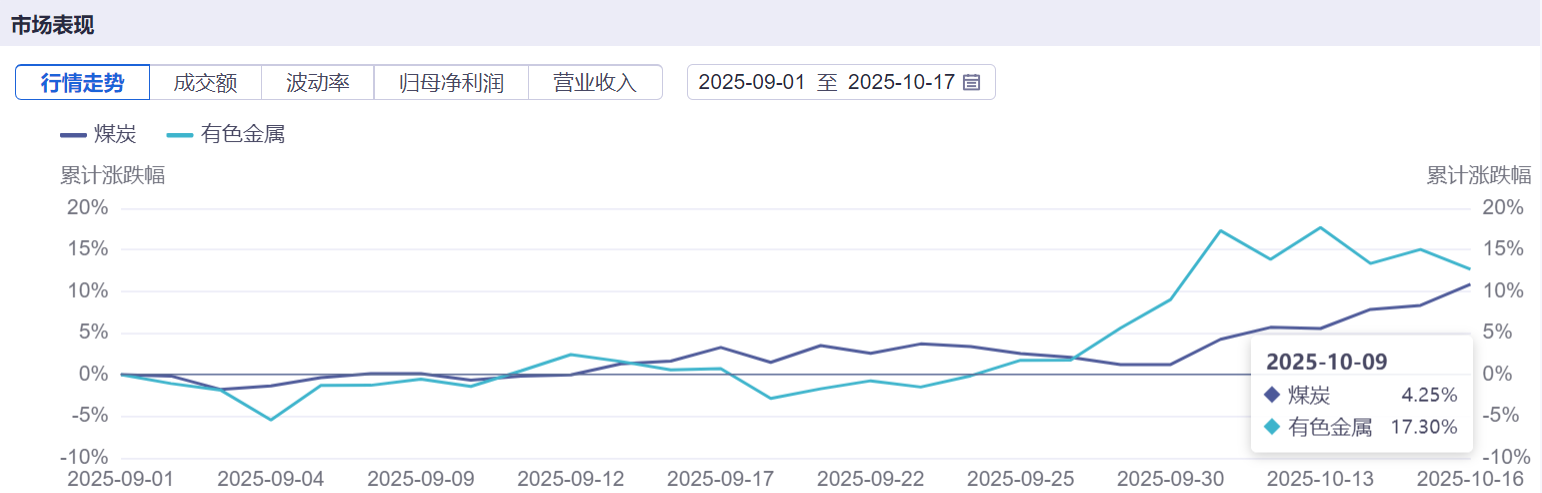 图片说明:国庆节前后煤炭与有色金属申万指数涨幅对比,数据来源于同花顺