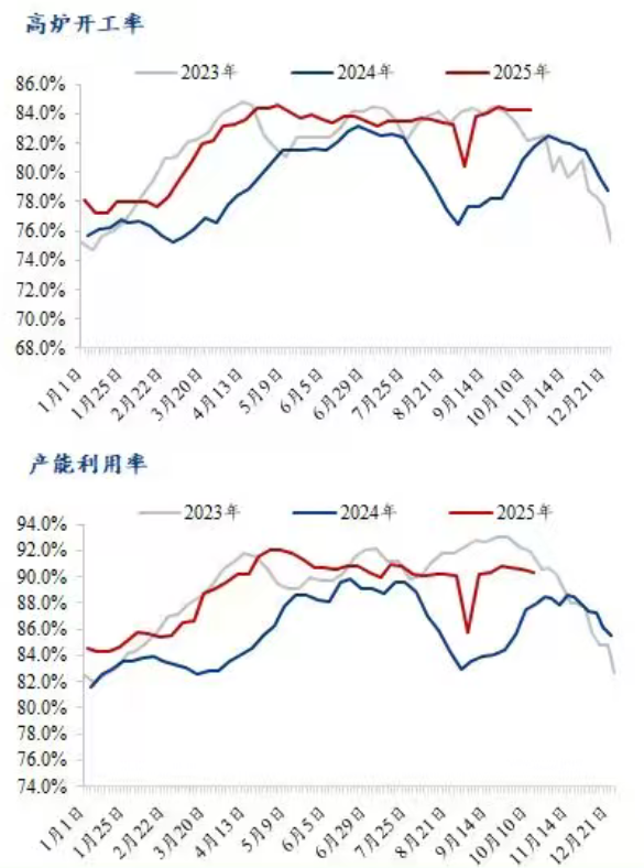 需求方面也出现了积极变化。动力煤方面,南方受副热带高压影响气温偏高,电力需求旺盛。进入十月,沿海八省动力煤用户平均日耗同比上升约16%,电厂库存节后迅速下降,彰显需求韧性。炼焦煤下游企业前期库存有所消耗,采购需求阶段性释放。高炉开工率和钢厂产能利用率保持高位,部分企业和中间环节的适当补库行为带动市场成交好转和库存回落。