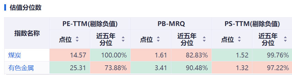 图片说明:煤炭与有色金属申万指数估值分位数对比,数据来源于同花顺