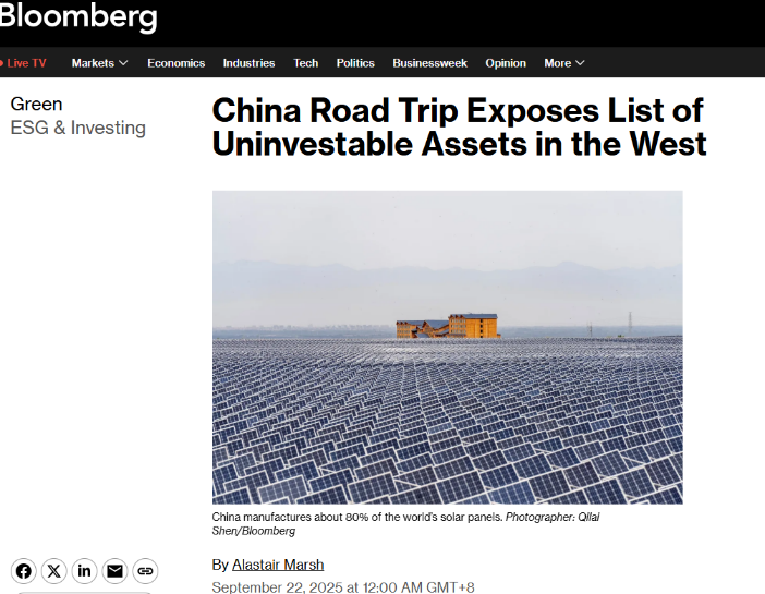 彭博社近期有一篇文章,标题为《China Road Trip Exposes List of Uninvestable Assets in the West》,报道称无论是技术创新速度,还是量产交付能力,或是产业链布局,中国在能源转型方面,都占据了“全方位”的碾压优势,“无法追赶”。