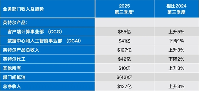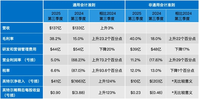 2025年第三季度,Intel取得了137亿美元的总收入,同比增长3%,提升不是很大,但去年同期的亏损166亿美元,如今变成了净赚41亿美元,简直是云壤之别。