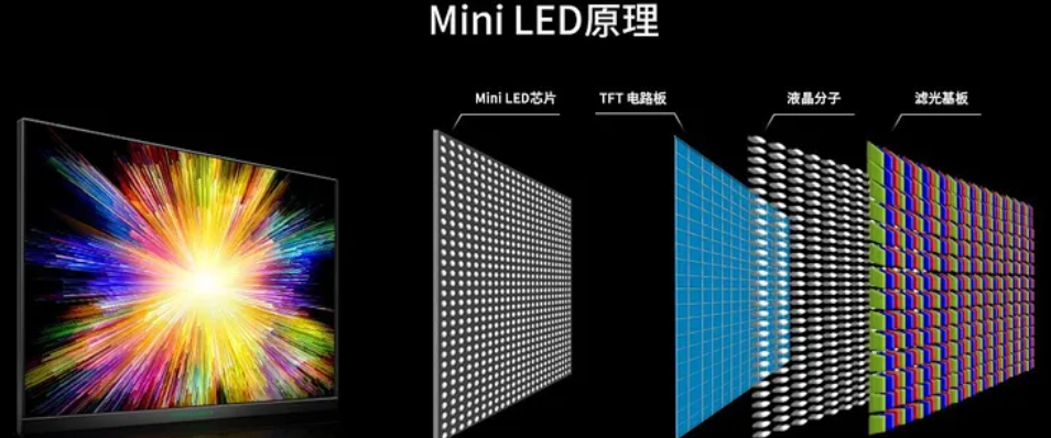 值得一提的是,中高端电视普遍采用Mini LED技术,该技术的核心在于将LCD的面光源改成可分区控光的点光源。其优点主要为:一是采用更精密的LED芯片,亮度更高,尤其观看HDR视频时,视觉体验更佳;二是分区控制越精细,越能实现更精准的调光,从而显著提高画面的对比度。三是在暗区或者无显示内容的区域,电视可以降低亮度或者直接关闭相应分区,从而可以更加节能省电。