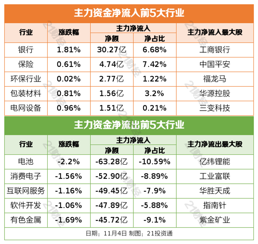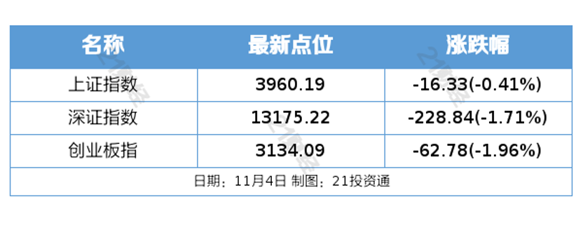 11月4日,市场全天缩量调整,创业板指跌近2%。截至收盘,沪指跌0.41%,深成指跌1.71%,创业板指跌1.96%。量能继续萎缩,沪深两市成交额不足2万亿元,较上一个交易日缩量1914亿元。