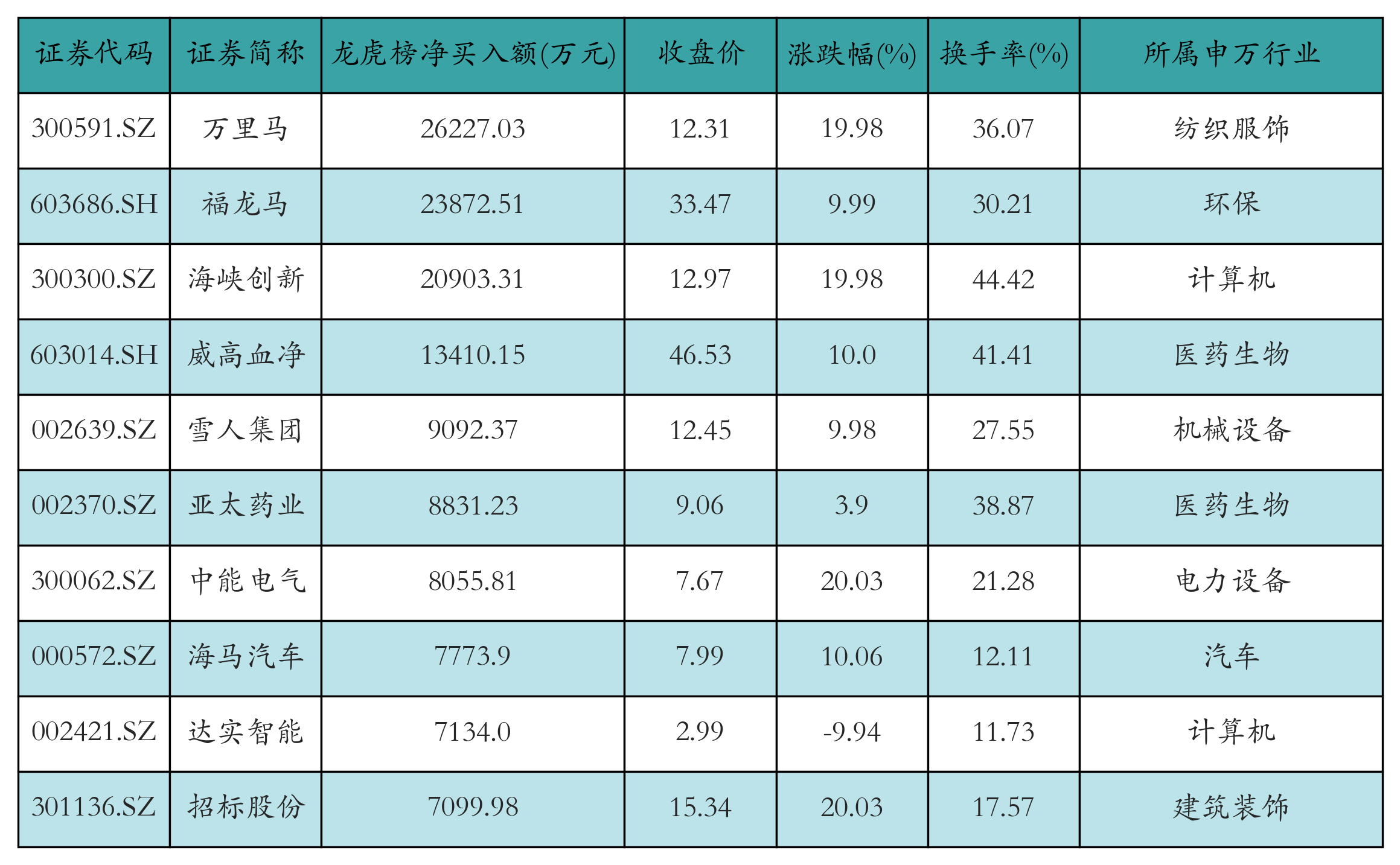 昨日龙虎榜营业部净买入额前10详情见下表: