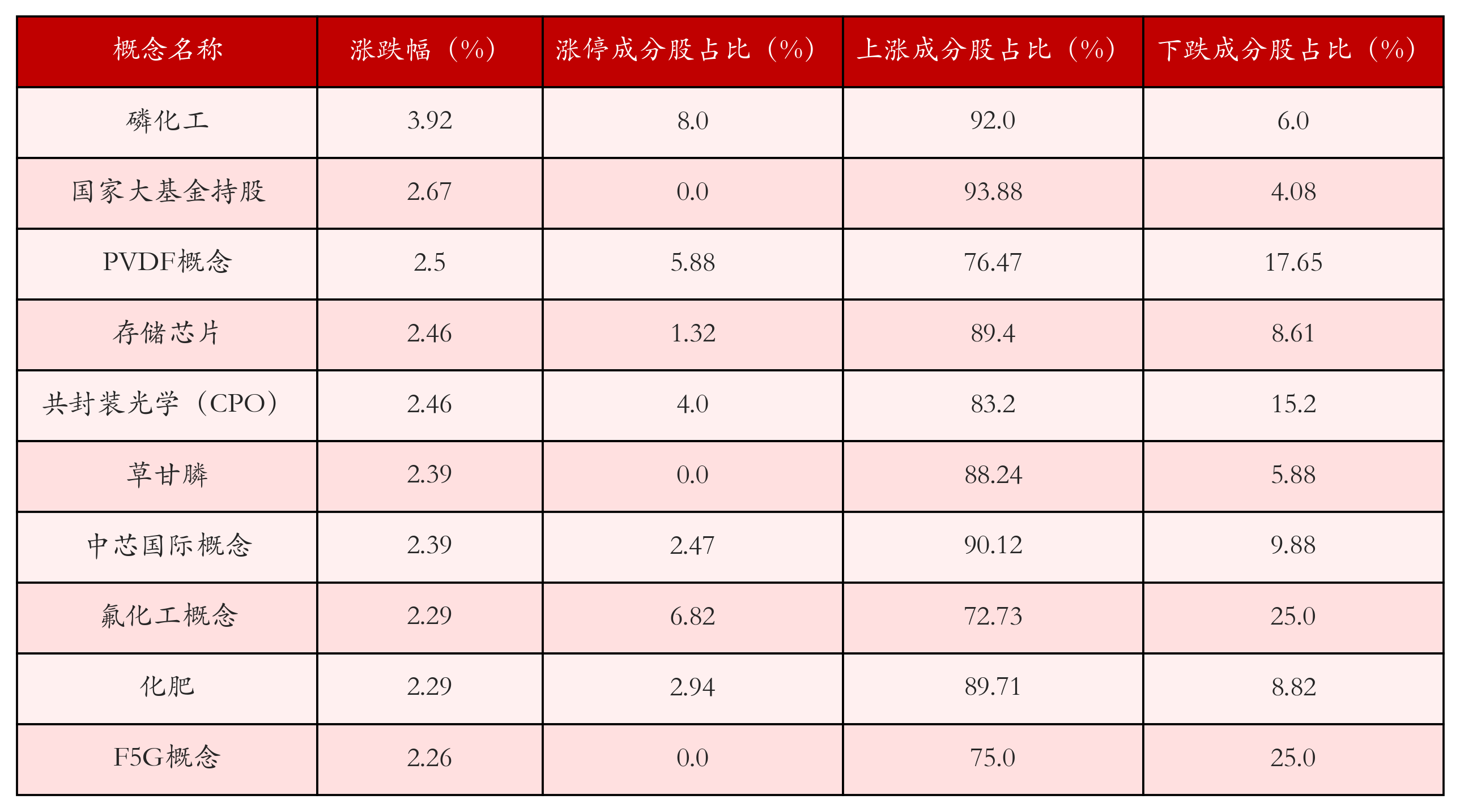 根据A股概念涨跌幅与所对应的股票池综合分析,涨幅靠前的三个概念板块分别为:磷化工、国家大基金持股与PVDF概念。排名前10位的概念板块相关数据见下表:
