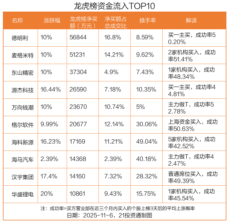 11月6日,上证指数上涨0.97%,深证成指上涨1.73%,创业板指上涨1.84%。盘后龙虎榜数据显示,共有52只个股因当日异动登上龙虎榜,资金净流入最多的是德明利(001309.SZ),达5.68亿元。