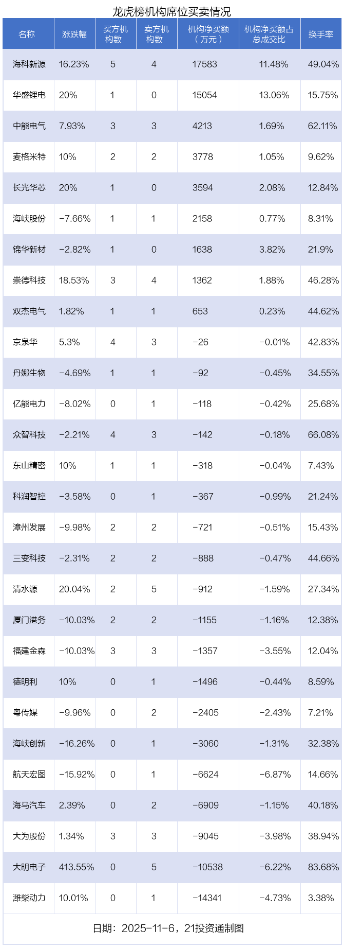 其中,机构净买入金额最多的是海科新源(301292.SZ),当日收盘上涨16.23%,换手率为49.04%。