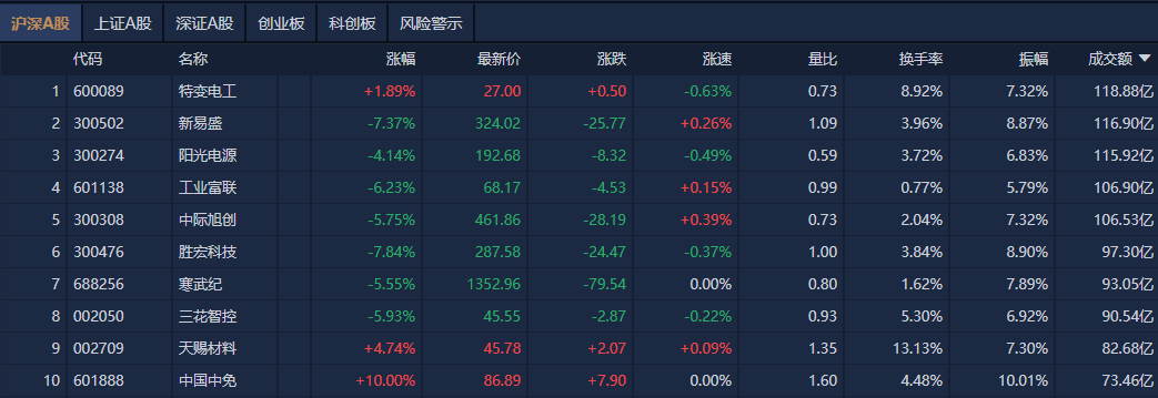 个股方面,特变电工成交额超118亿元居首,新易盛、阳光电源、工业富联成交额靠前。
