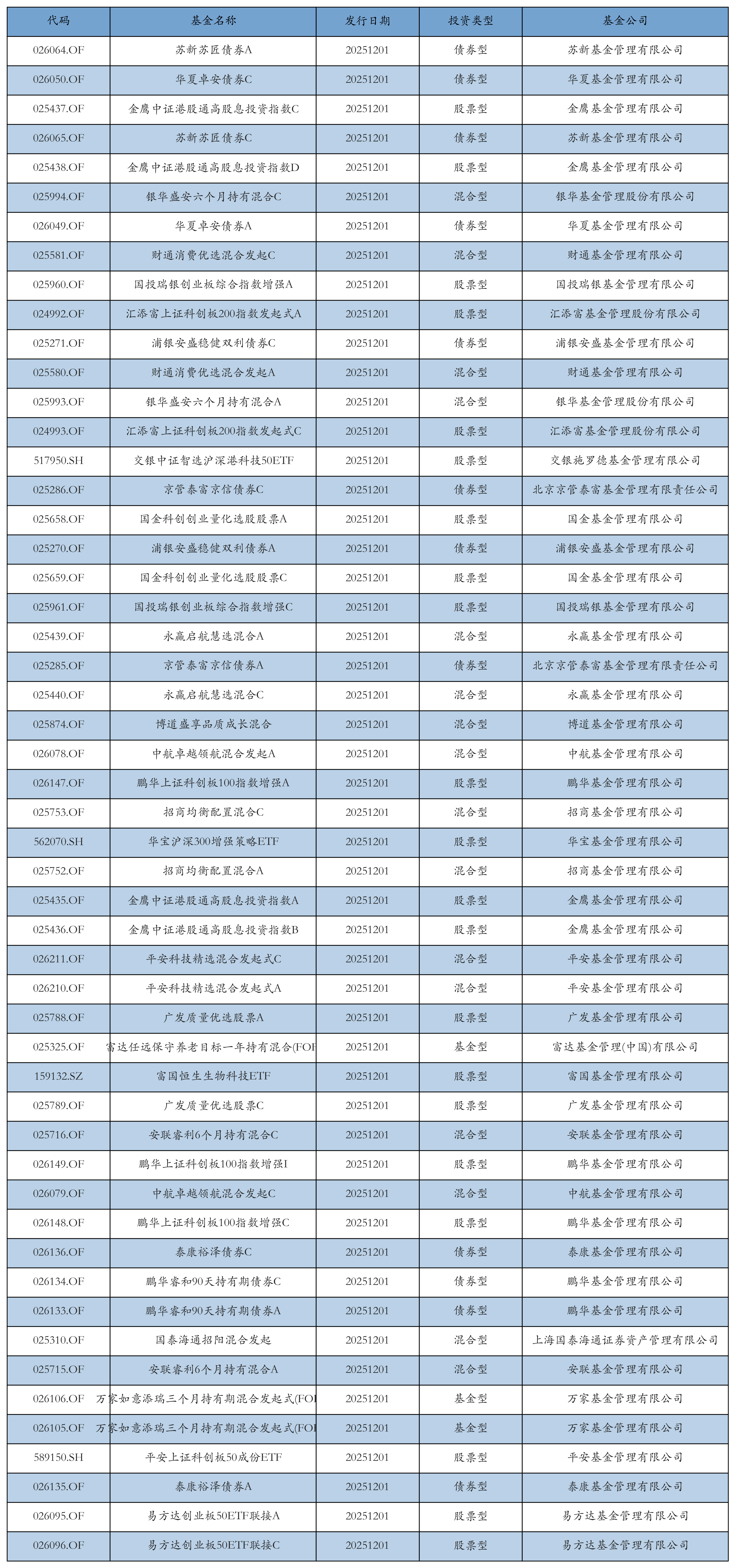 昨日有52只新基金发行,分别为:苏新苏匠债券A、华夏卓安债券C、金鹰中证港股通高股息投资指数C、苏新苏匠债券C、金鹰中证港股通高股息投资指数D、银华盛安六个月持有混合C、华夏卓安债券A、财通消费优选混合发起C、国投瑞银创业板综合指数增强A、汇添富上证科创板200指数发起式A、浦银安盛稳健双利债券C、财通消费优选混合发起A、银华盛安六个月持有混合A、汇添富上证科创板200指数发起式C、交银中证智选沪深港科技50ETF、京管泰富京信债券C、国金科创创业量化选股股票A、浦银安盛稳健双利债券A、国金科创创业量化选股股票C、国投瑞银创业板综合指数增强C、永赢启航慧选混合A、京管泰富京信债券A、永赢启航慧选混合C、博道盛享品质成长混合、中航卓越领航混合发起A、鹏华上证科创板100指数增强A、招商均衡配置混合C、华宝沪深300增强策略ETF、招商均衡配置混合A、金鹰中证港股通高股息投资指数A、金鹰中证港股通高股息投资指数B、平安科技精选混合发起式C、平安科技精选混合发起式A、广发质量优选股票A、富达任远保守养老目标一年持有混合(FOF)、富国恒生生物科技ETF、广发质量优选股票C、安联睿利6个月持有混合C、鹏华上证科创板100指数增强I、中航卓越领航混合发起C、鹏华上证科创板100指数增强C、泰康裕泽债券C、鹏华睿和90天持有期债券C、鹏华睿和90天持有期债券A、国泰海通招阳混合发起、安联睿利6个月持有混合A、万家如意添瑞三个月持有期混合发起式(FOF)C、万家如意添瑞三个月持有期混合发起式(FOF)A、平安上证科创板50成份ETF、泰康裕泽债券A、易方达创业板50ETF联接A、易方达创业板50ETF联接C,详情见下表:
