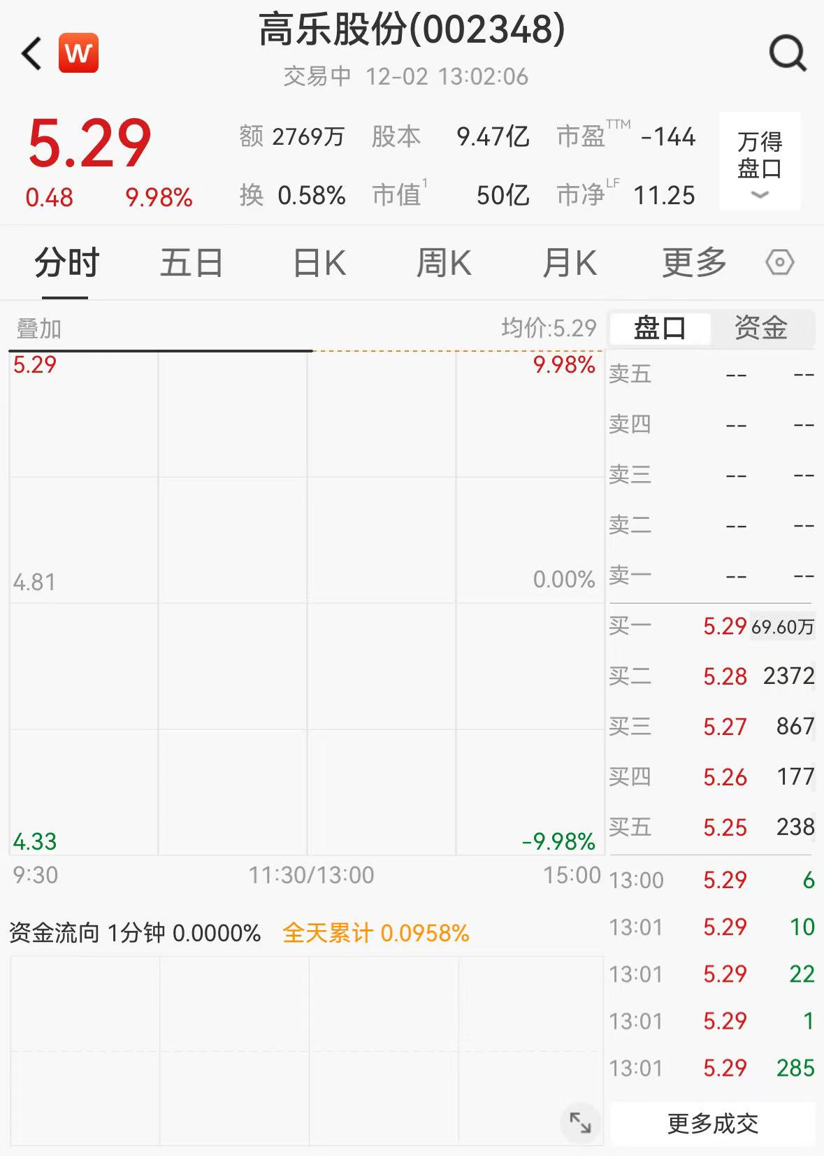 12月2日,玩具龙头高乐股份复牌后“一字”涨停,报5.29元/股,封单一度超80万手,年内股价涨超78%。