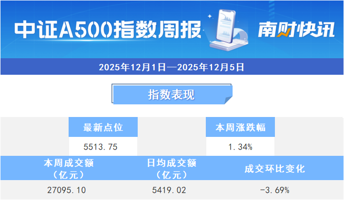 本周中证A500指数上涨1.34%,截至12月5日收盘,报5513.75点。本周日均平均成交额为5419.02亿元,单日成交额环比下降3.69%。
