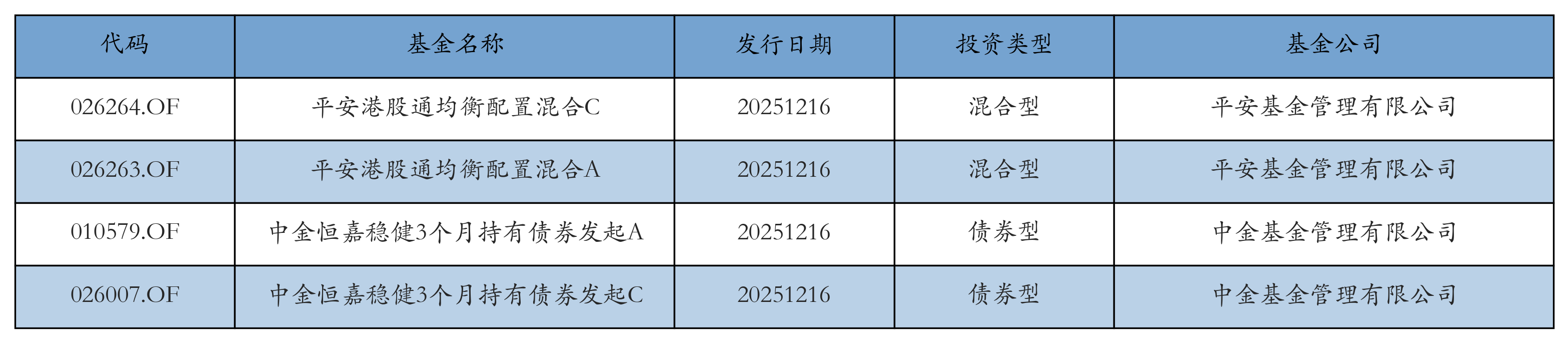昨日有4只新基金发行,分别为:平安港股通均衡配置混合C、平安港股通均衡配置混合A、中金恒嘉稳健3个月持有债券发起A、中金恒嘉稳健3个月持有债券发起C,详情见下表: