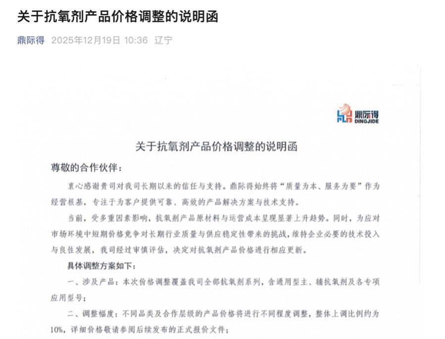 国产抗氧剂行业迎来密集调价潮。12月19日,鼎际得(603255.SH)在官方渠道发布关于抗氧剂产品价格调整的说明函,宣布对公司全部抗氧剂系列产品价格进行更新,整体上调比例约为10%,新价格自发布之日起生效。