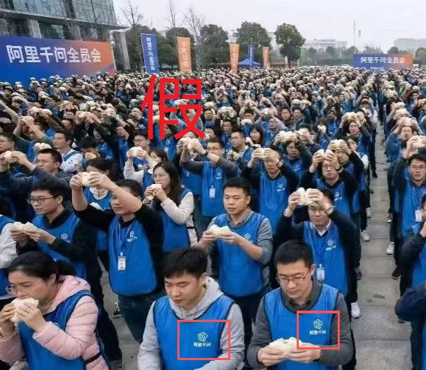 12月19日,21财经《辟谣财知道》注意到,网络流传一张所谓”阿里千问全员会”图片,图中疑似阿里千问员工聚集在广场上手举豆包,广场一侧有“干死豆包”标语。