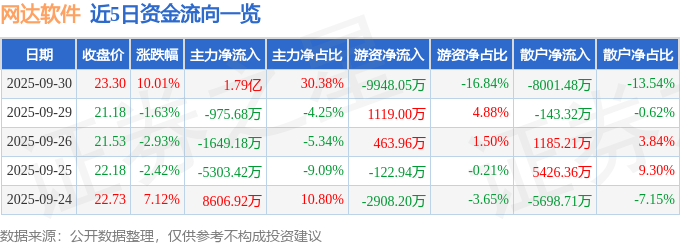 证券之星消息,网达软件9月30日涨停收盘,收盘价23.3元。该股于9点35分涨停,2次打开涨停,截止收盘封单资金为3442.57万元,占其流通市值0.55%。