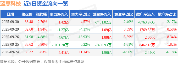证券之星消息,截至2025年9月30日收盘,蓝思科技(300433)报收于33.48元,上涨2.7%,换手率1.89%,成交量94.06万手,成交额31.18亿元。