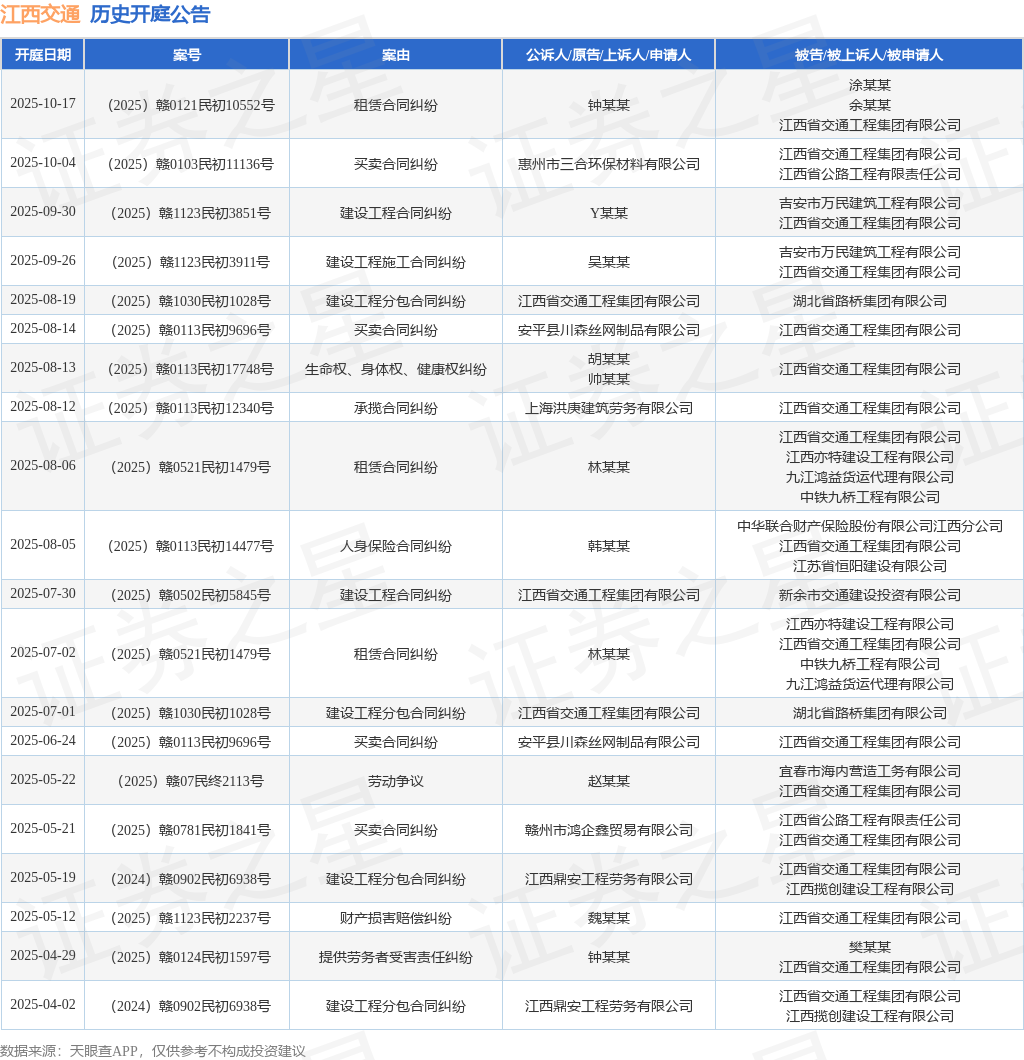 案号:(2025)赣0103民初11136号根据统计,近一年内以江西省交通工程集团有限公司为当事人的历史开庭公告有32则,其中案由为“买卖合同纠纷”的公告以6则居首,其次为“建设工程分包合同纠纷”有5则,“建设工程施工合同纠纷”有4则。历史开庭公告(前20条)如下: