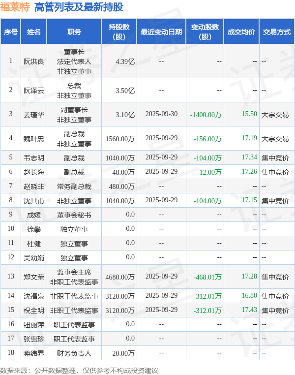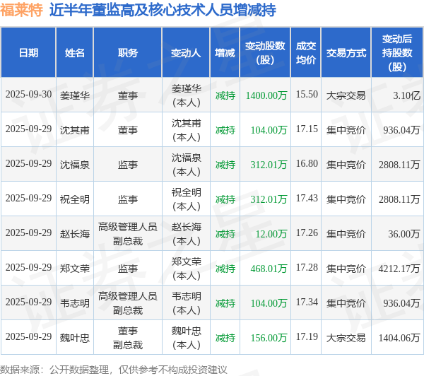福莱特近半年内的董监高及核心技术人员增减持详情如下:
