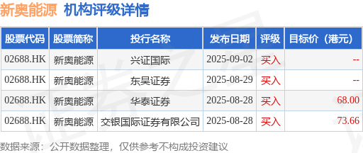 截至2025年10月9日收盘,新奥能源(02688.HK)报收于65.25港元,上涨2.84%,成交量502.14万股,成交额3.26亿港元。投行对该股的评级以买入为主,近90天内共有4家投行给出买入评级,近90天的目标均价为70.83港元。兴证国际最新一份研报给予新奥能源买入评级。