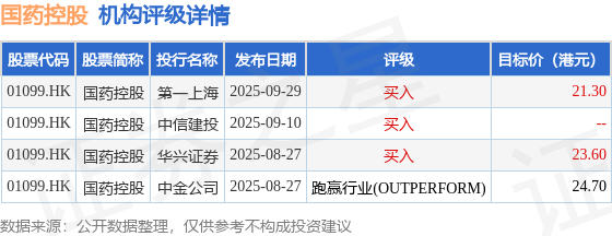 截至2025年10月9日收盘,国药控股(01099.HK)报收于18.7港元,上涨1.69%,成交量689.25万股,成交额1.29亿港元。投行对该股的评级以买入为主,近90天内共有3家投行给出买入评级,近90天的目标均价为23.2港元。第一上海最新一份研报给予国药控股买入评级,目标价21.3港元。
