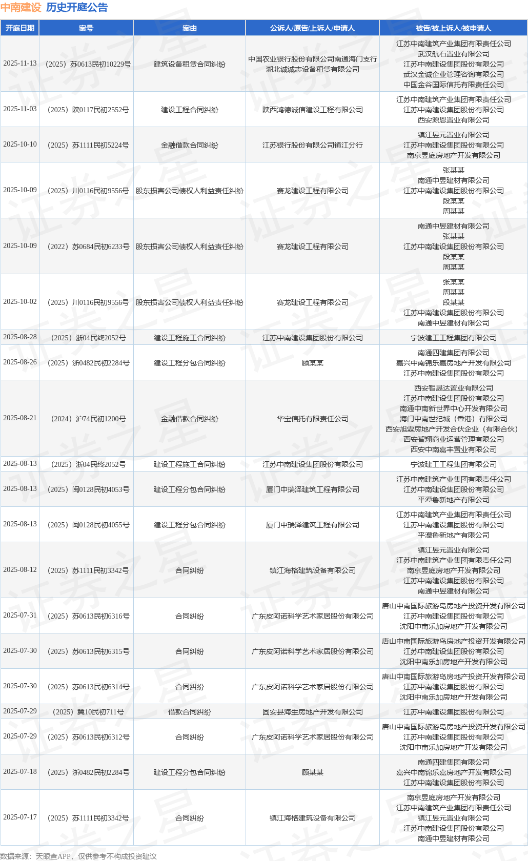 案号:(2025)苏1111民初5224号根据统计,近一年内以江苏中南建设集团股份有限公司为当事人的历史开庭公告有163则,其中案由为“合同纠纷”的公告以34则居首,其次为“买卖合同纠纷”有17则,“建设工程分包合同纠纷”有11则。历史开庭公告(前20条)如下: