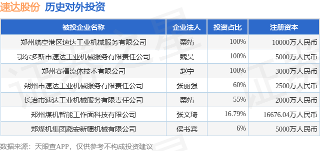 证券之星消息,根据天眼查APP显示,速达股份(001277.SZ)新增一起对外投资事件,被投资公司为郑煤机集团潞安新疆机械有限公司,法定代表人侯书宾,投资占比为6%。该公司从事专用设备制造业,注册资本为5000万人民币。目前,速达股份共存在对外投资7项,详见下表: