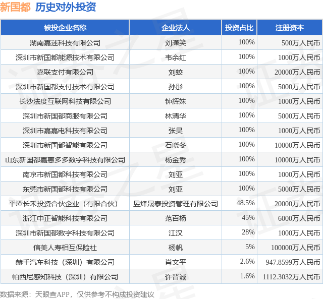 证券之星消息,根据天眼查APP显示,新国都(300130.SZ)新增一起对外投资事件,被投资公司为湖南嘉迷科技有限公司,法定代表人刘潇笑,投资占比为100%。该公司从事软件和信息技术服务业,注册资本为500万人民币。目前,新国都共存在对外投资17项,详见下表: