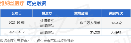 证券之星消息,根据天眼查APP于10月8日公布的信息整理,维纳丝医疗科技(苏州)有限公司Pre-A轮融资,融资额数千万人民币,参与投资的机构包括怀格资本,翰驰创投。