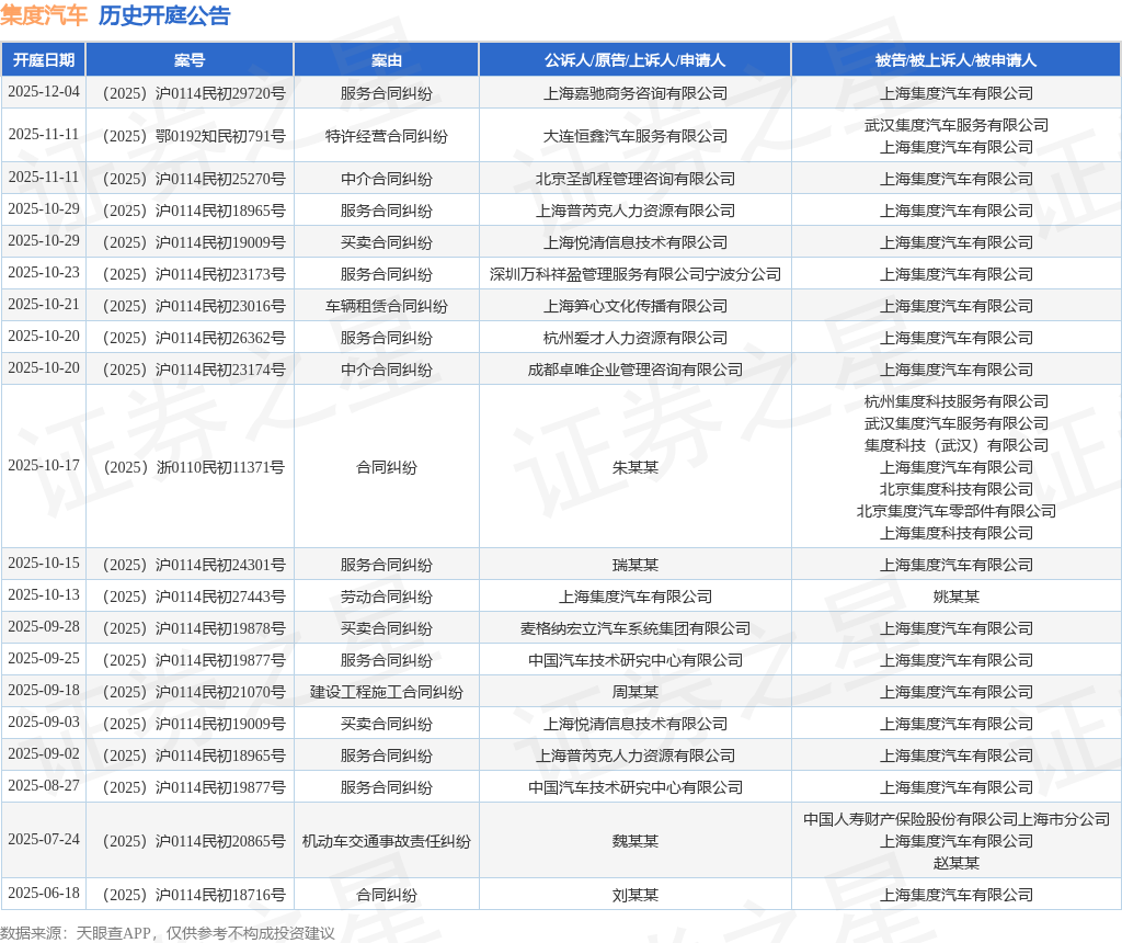 案号:(2025)沪0114民初27443号根据统计,近一年内以上海集度汽车有限公司为当事人的历史开庭公告有34则,其中案由为“服务合同纠纷”的公告以9则居首,其次为“金融借款合同纠纷”有6则,“中介合同纠纷”有5则。历史开庭公告(前20条)如下: