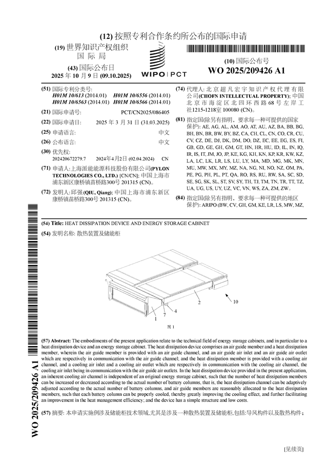 证券之星消息,根据企查查数据显示派能科技(688063)公布了一项国际专利申请,专利名为“散热装置及储能柜”,专利申请号为PCT/CN2025/086405,国际公布日为2025年10月9日。