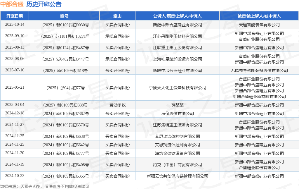 案号:(2025)新0109民初9030号根据统计,近一年内以新疆中部合盛硅业有限公司为当事人的历史开庭公告有14则,其中案由为“买卖合同纠纷”的公告以11则居首,其次为“承揽合同纠纷”有2则,“劳动争议”有1则。历史开庭公告如下: