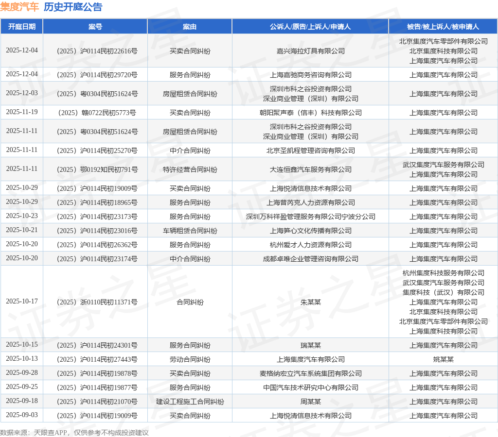 案号:(2025)沪0114民初24301号根据统计,近一年内以上海集度汽车有限公司为当事人的历史开庭公告有38则,其中案由为“服务合同纠纷”的公告以9则居首,其次为“买卖合同纠纷”有6则,“金融借款合同纠纷”有6则。历史开庭公告(前20条)如下: